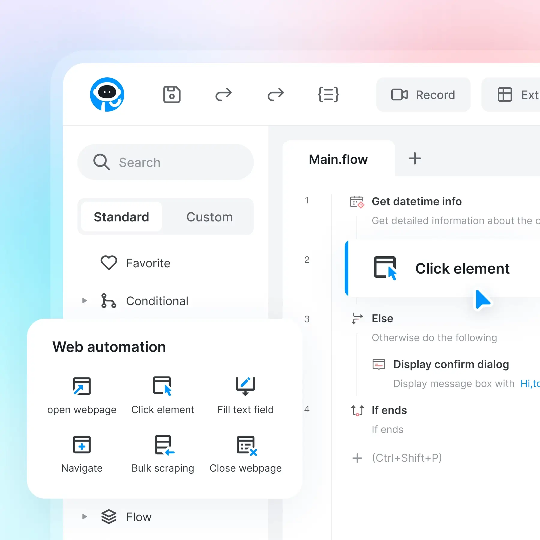 記録と再生:ブラウザーのアクション (クリック、入力) をキャプチャし、再利用可能なワークフローに変換します。