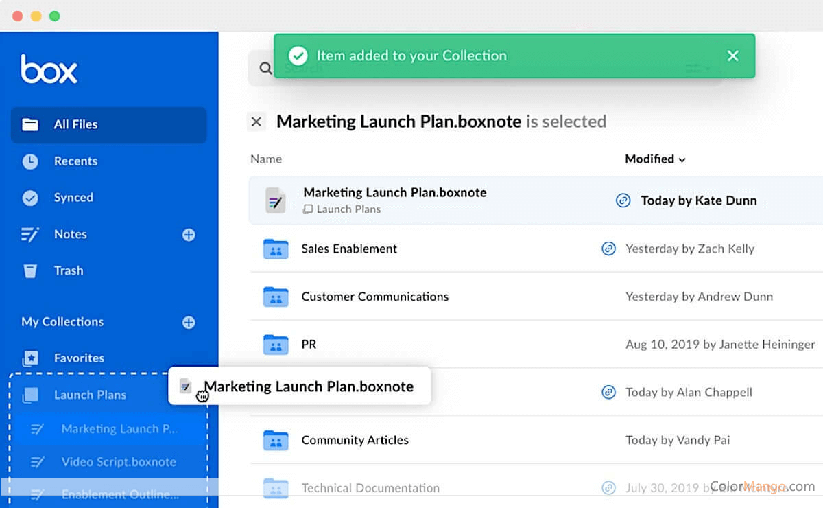 Box Inc. の特徴- 安全なクラウドストレージ:Boxは、保存中も転送中もAES-256暗号化を使用して、ファイルを安全にクラウドストレージに保存します。