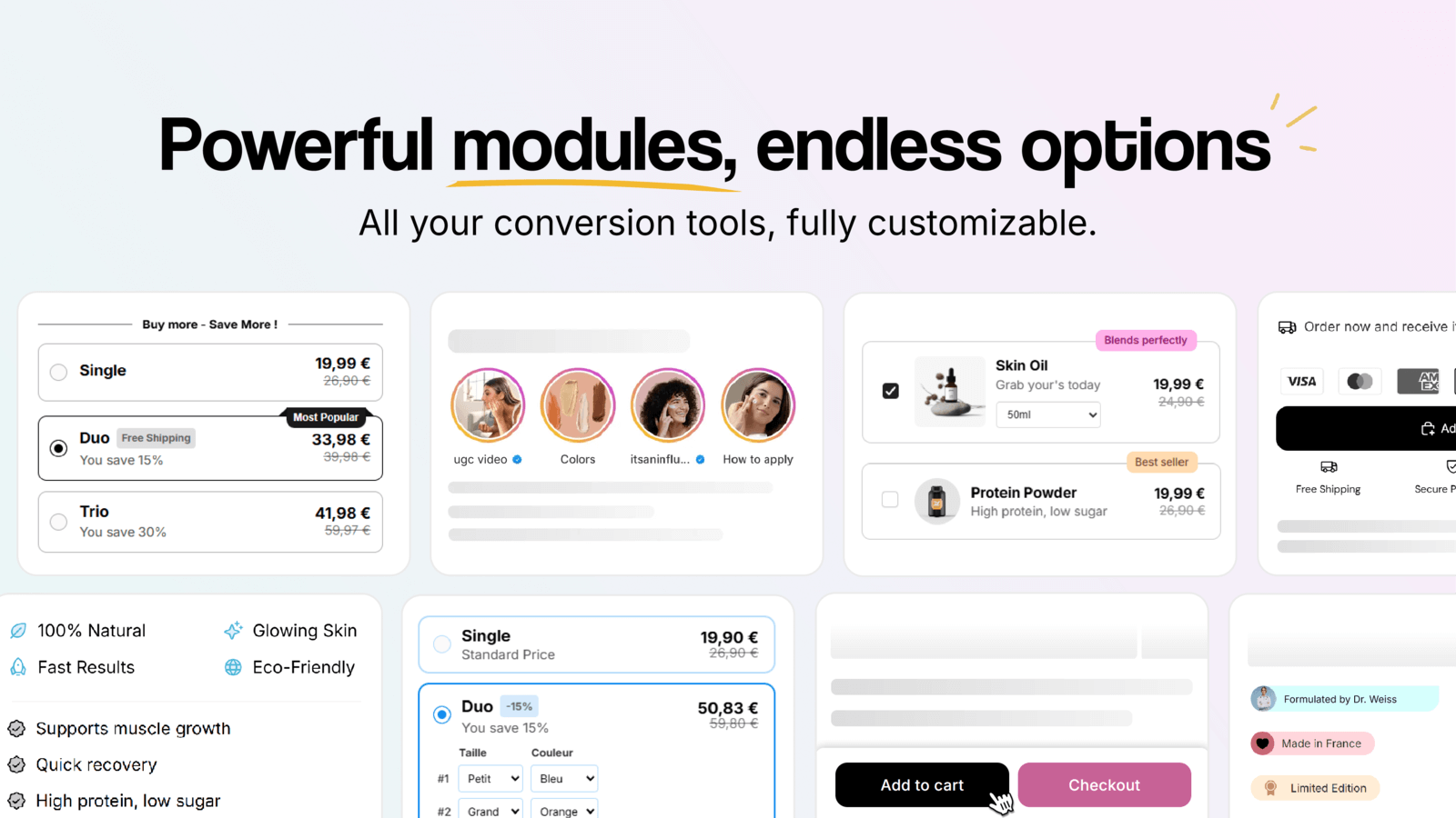 • 製品、コレクション、デバイスごとにモジュールをオン/オフし、公開前にプレビューできます。