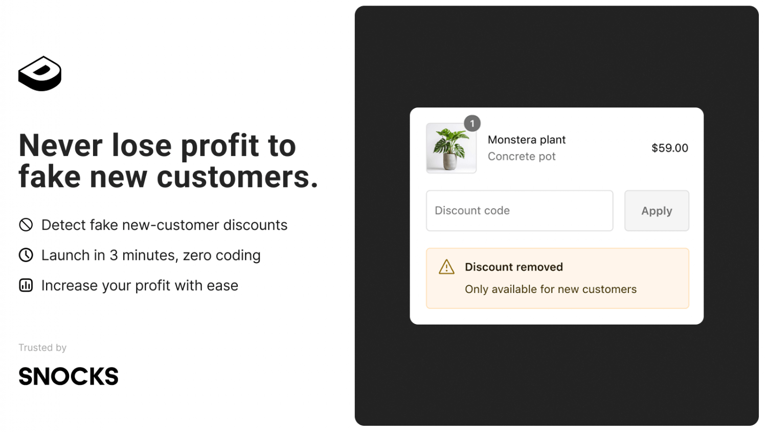 Shopify Plusのリアルタイムの不正検出とカスタム割引ルールにより、割引コードの悪用を防ぎます。