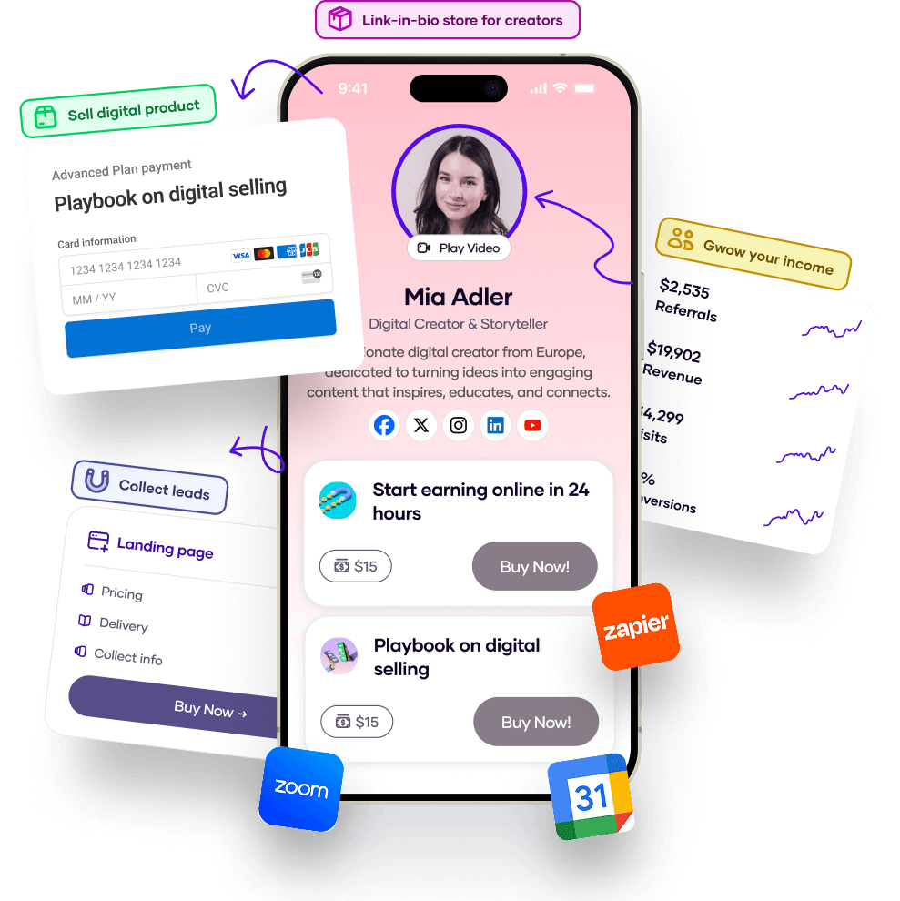 デジタルオファーの迅速な販売を合理化し、支払いと予約を自動化し、ソーシャルリンクやドメインからのオーディエンスと収益を増やすのに役立ちます。