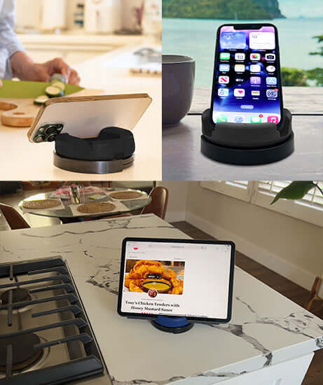 安定した視野角とユニバーサル互換性を備えた、用途の広い360°スマートフォンおよびタブレットスタンド。
