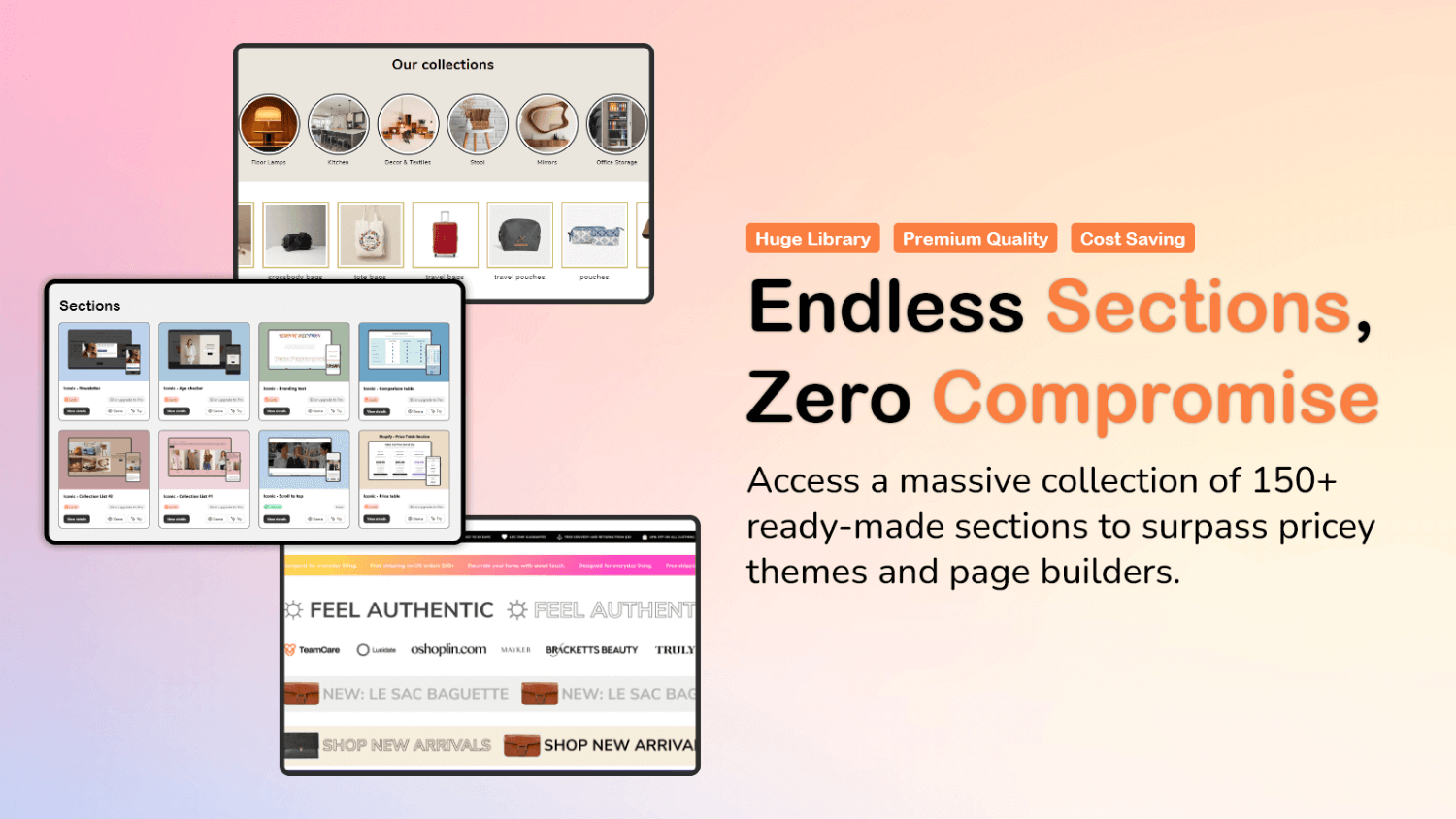 • どのShopifyテーマでも機能する150以上のすぐに使えるセクションと商品ブロック。