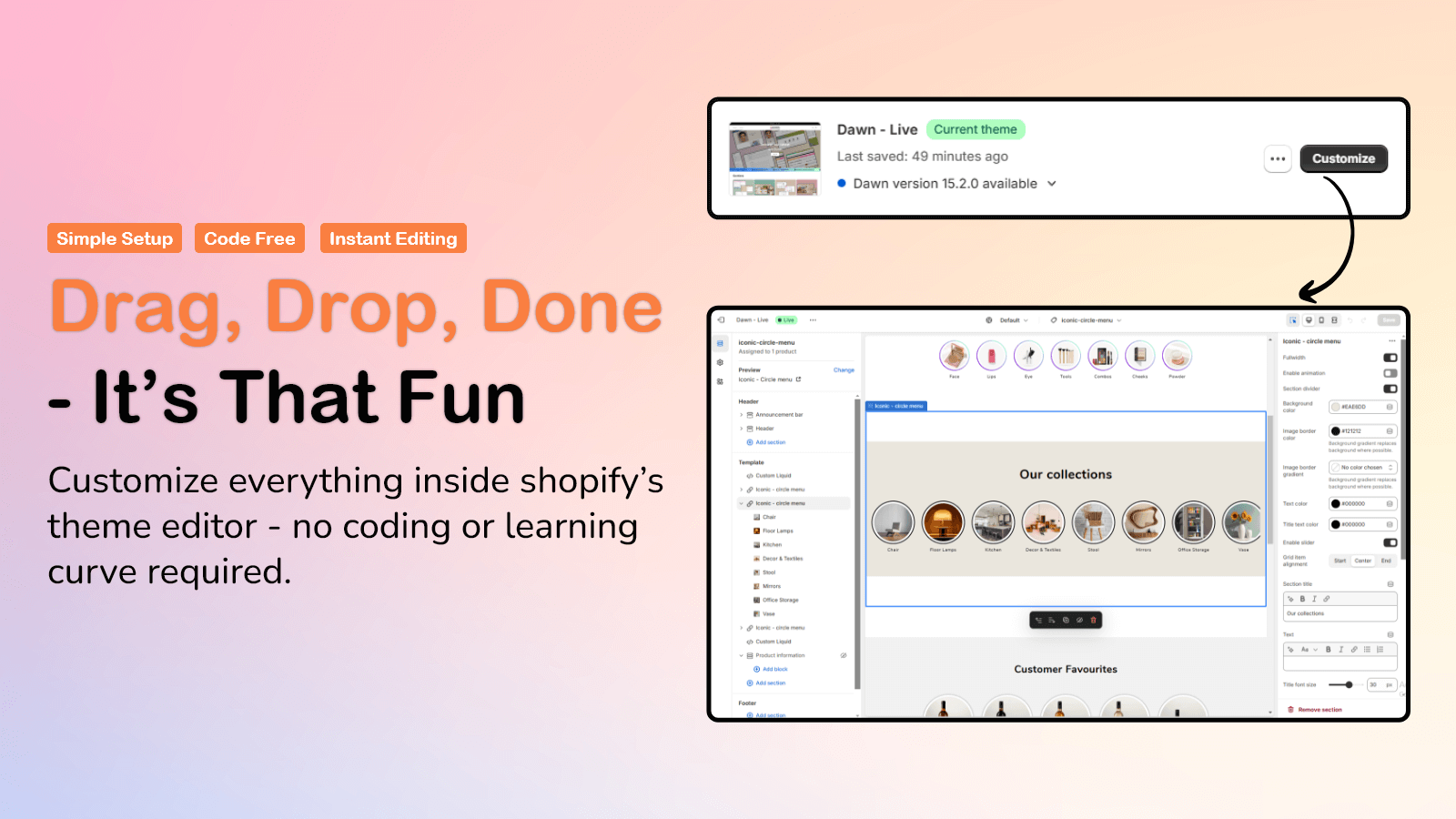 • Shopifyテーマエディターですべてをカスタマイズできます。コーディングや開発者は必要ありません。