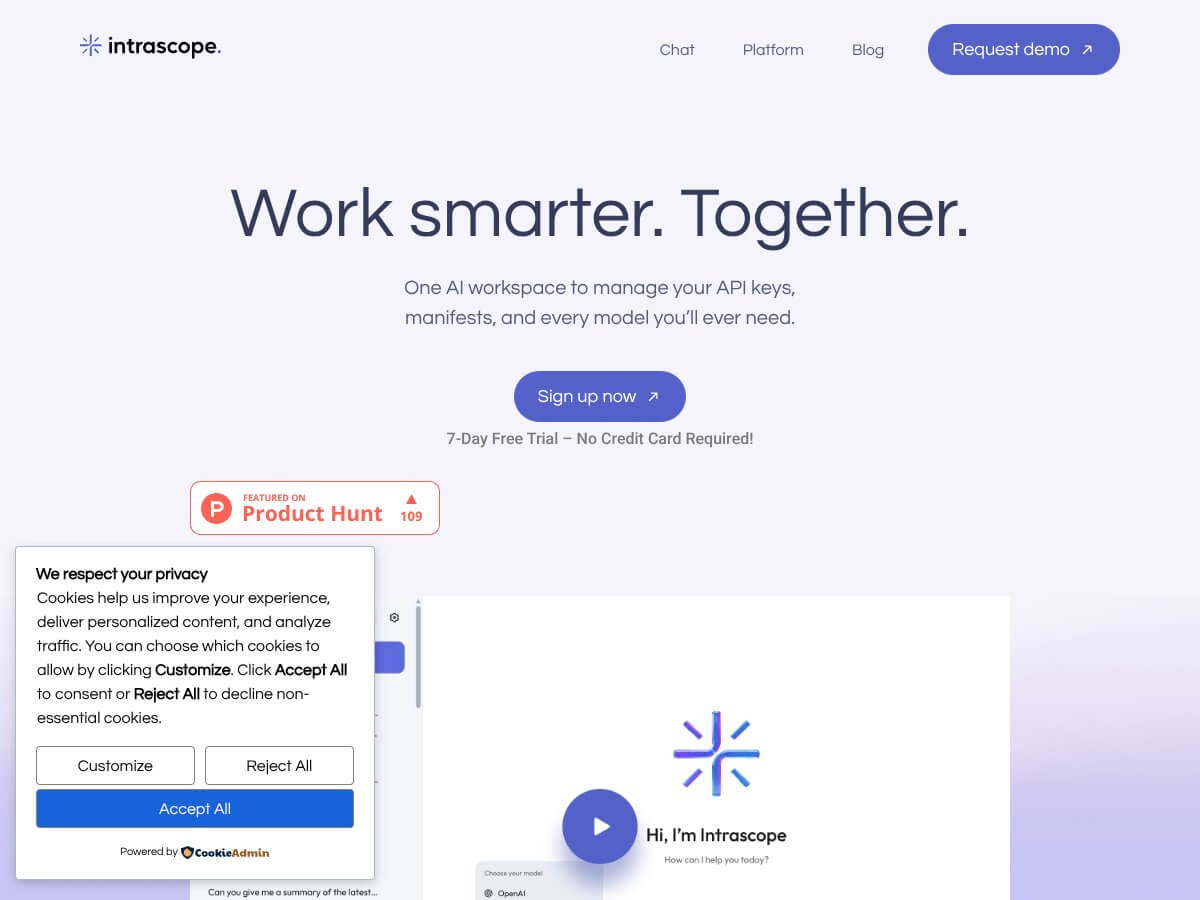 Intrascopeは安全なチームAIワークスペースで、複数のLLMを1か所にまとめ、コンテキスト(マニフェスト)、プロジェクト、管理者の使用/支出管理を共有します。