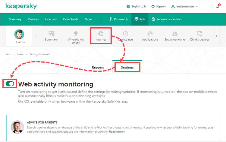 最近では子供がデジタル世界にアクセスするのは簡単ですが、危険なサイトから子供を守ることは親の責任です。Kaspersky Safe Kids は児童オンライン保護ソフトウェアです。子供用のアプリと保護者用のアプリを用意し、マイカスペルスキーアカウントを使って接続します。ユーザーはアカウントの設定をカスタマイズしたり、レポートを確認したりできます。Kaspersky Safe Kids には次のような機能があります。