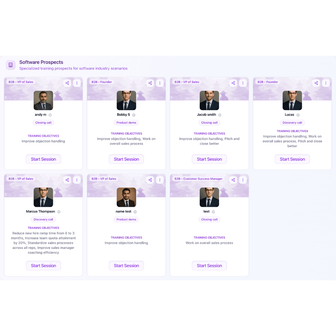 AI ロールプレイ・プラクティス:営業担当が対象となる、現実的な AI の見込み客を対象にトレーニングを行います。