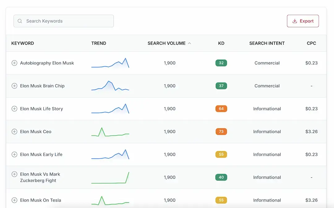 キーワードリサーチとクラスタリング:影響力の大きいキーワード (ロングテールを含む) を発見し、トレンド、検索量、競合を分析します。