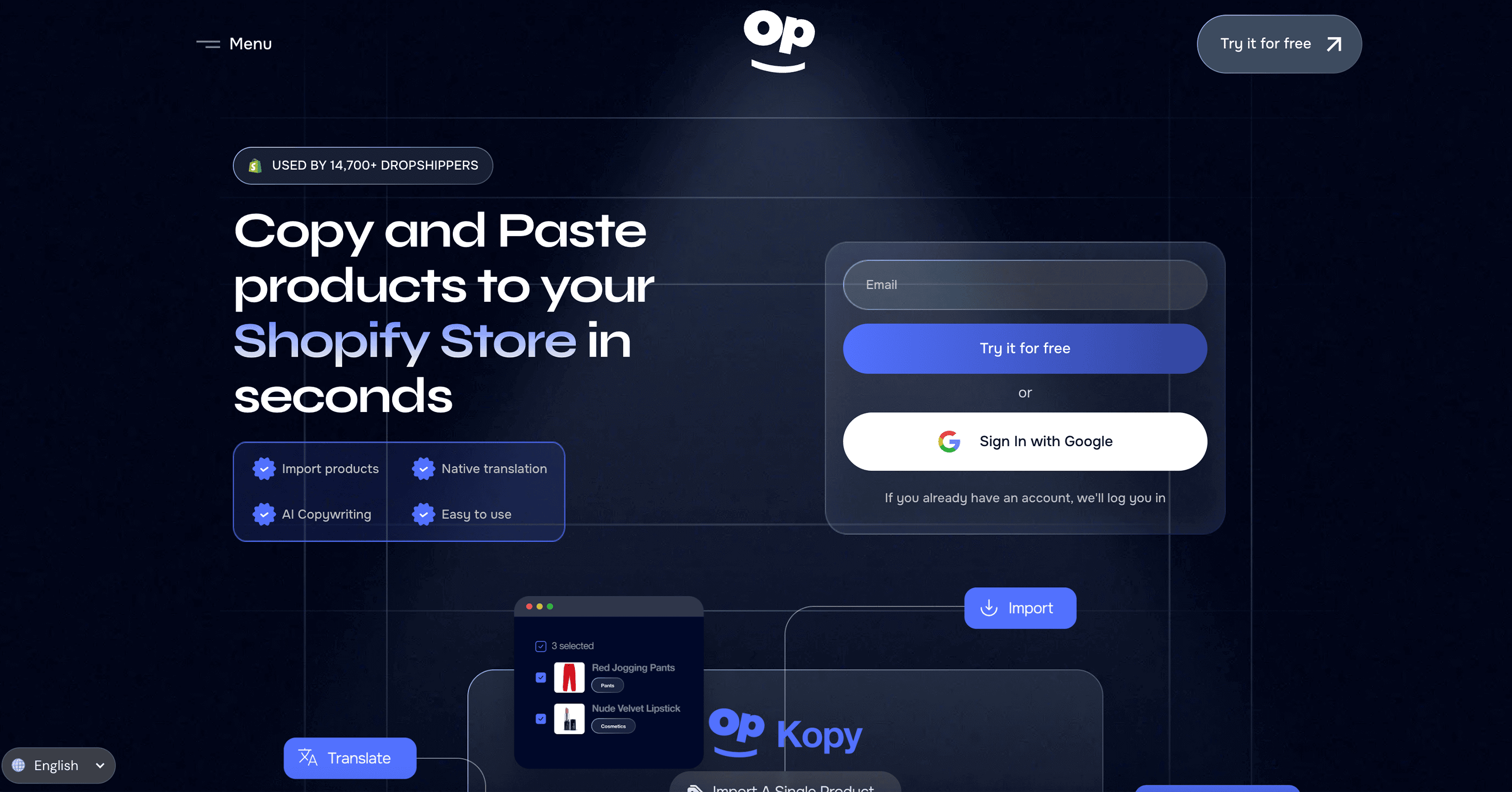AI搭載のShopifyツールにより、コンバージョン率の高い商品ページをワンクリックでコピー、翻訳、生成できます。