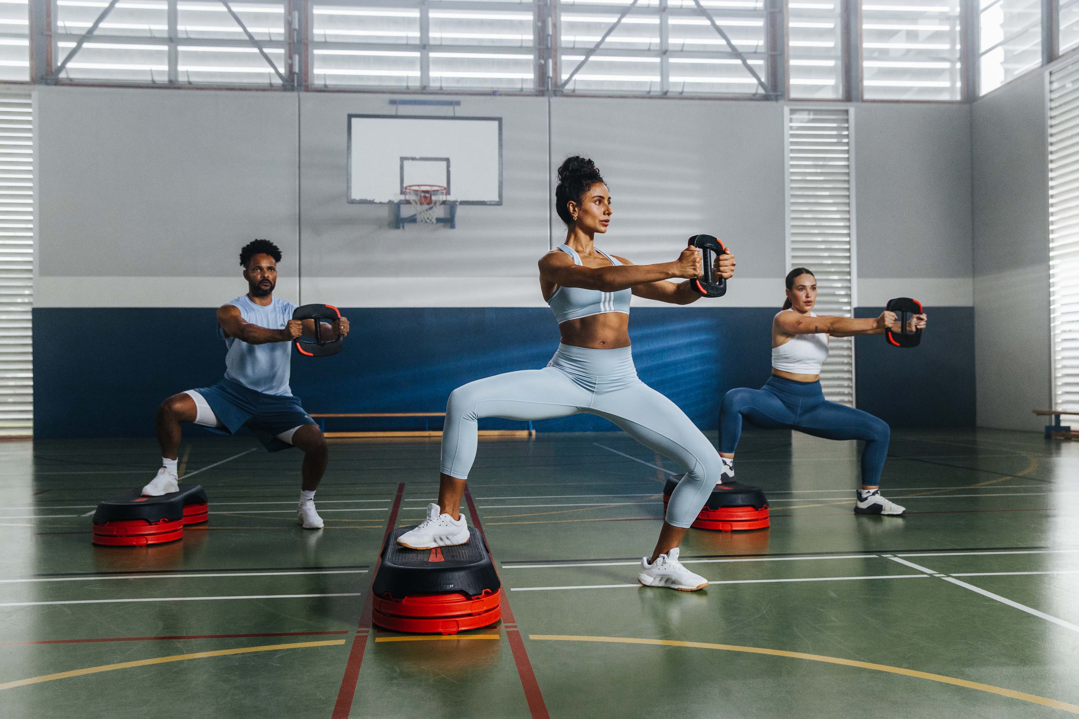 エアロビックステップ:SMARTSTEPシステムは、様々なフィットネスレベルに合わせて高さを調節できる有酸素運動用の多用途プラットフォームです。