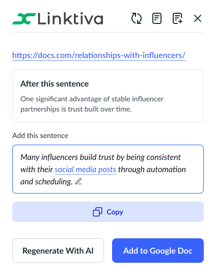 スマートAIアシスタントは、コンテンツ内のアンカーテキストを検出し、リンクの位置を自動提案します。