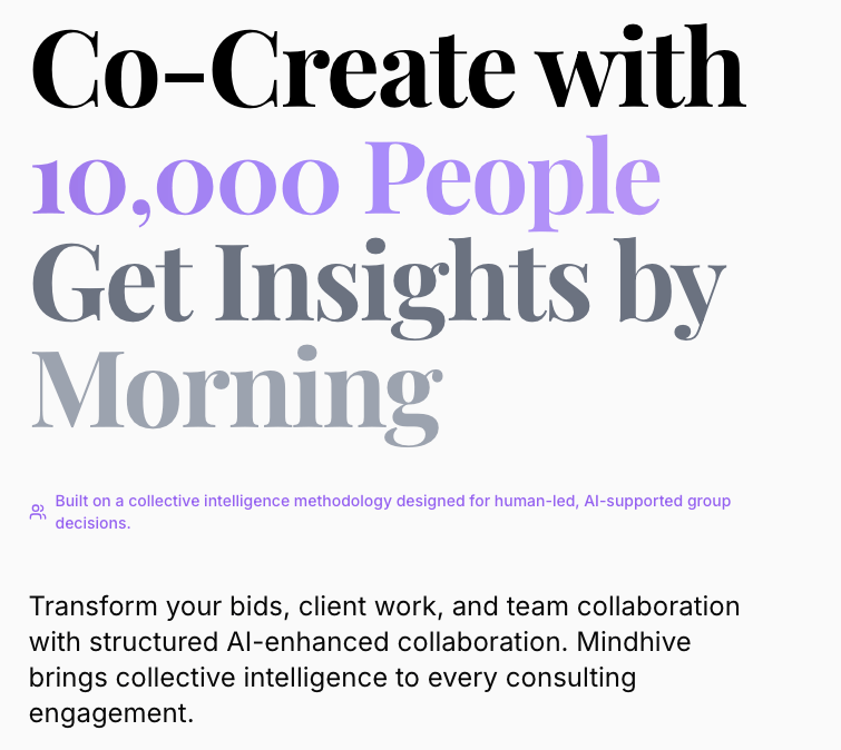 組織が人間の洞察とAIを組み合わせて複雑な課題に取り組み、意思決定を強化できるようにします。構造化されたディスカッション、AI を活用した調査、アイデアのランク付け、ステークホルダー・エンゲージメント・ツール、自動レポートを提供します。コンサルタント、チーム、企業が実用的な洞察を生み出し、戦略とイノベーションのワークフローを加速できるように設計されています。セクターや参加者グループ全体にわたるスケーラブルなコラボレーションをサポートします。