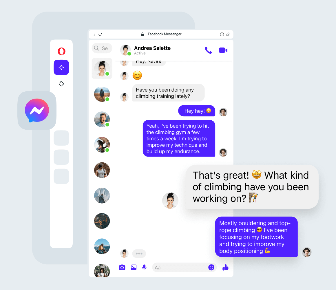 Opera Desktop Browserは、ブラウジングと生産性を兼ね備え、広告ブロッカー、無料のPro VPN、Aria AIアシスタント、組み込みのメッセンジャーとソーシャルメディアツールを提供します。