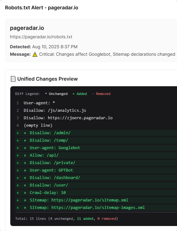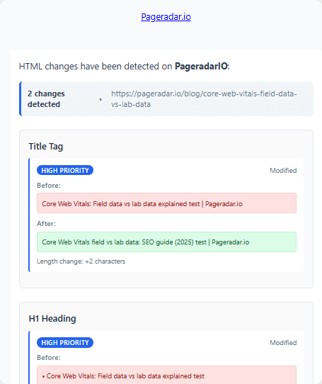 *SEO/HTML 要素の変更監視:タイトル、メタ、見出し、スキーマなどを追跡し、重大な変更があった場合は警告します。