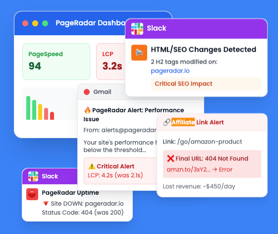 ウェブ速度、SEO要素、アフィリエイトリンクをリアルタイムで監視し、問題が発生してランキングが損なわれる前にアラートを受け取ります。