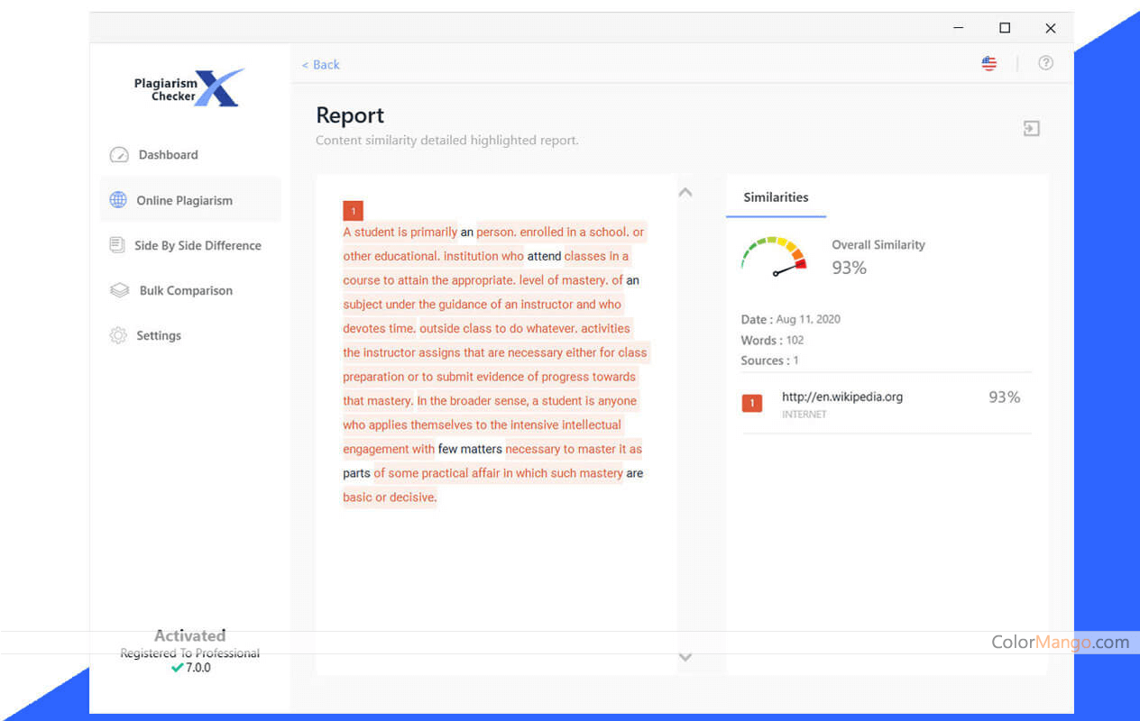 非常に優れた盗作チェックツールで、テキスト文書やWebページにコピーされた資料を確認して特定し、盗作の有無を判断できます。同様の割合や密度の発生回数も含めて、結果が正確に表示されます。