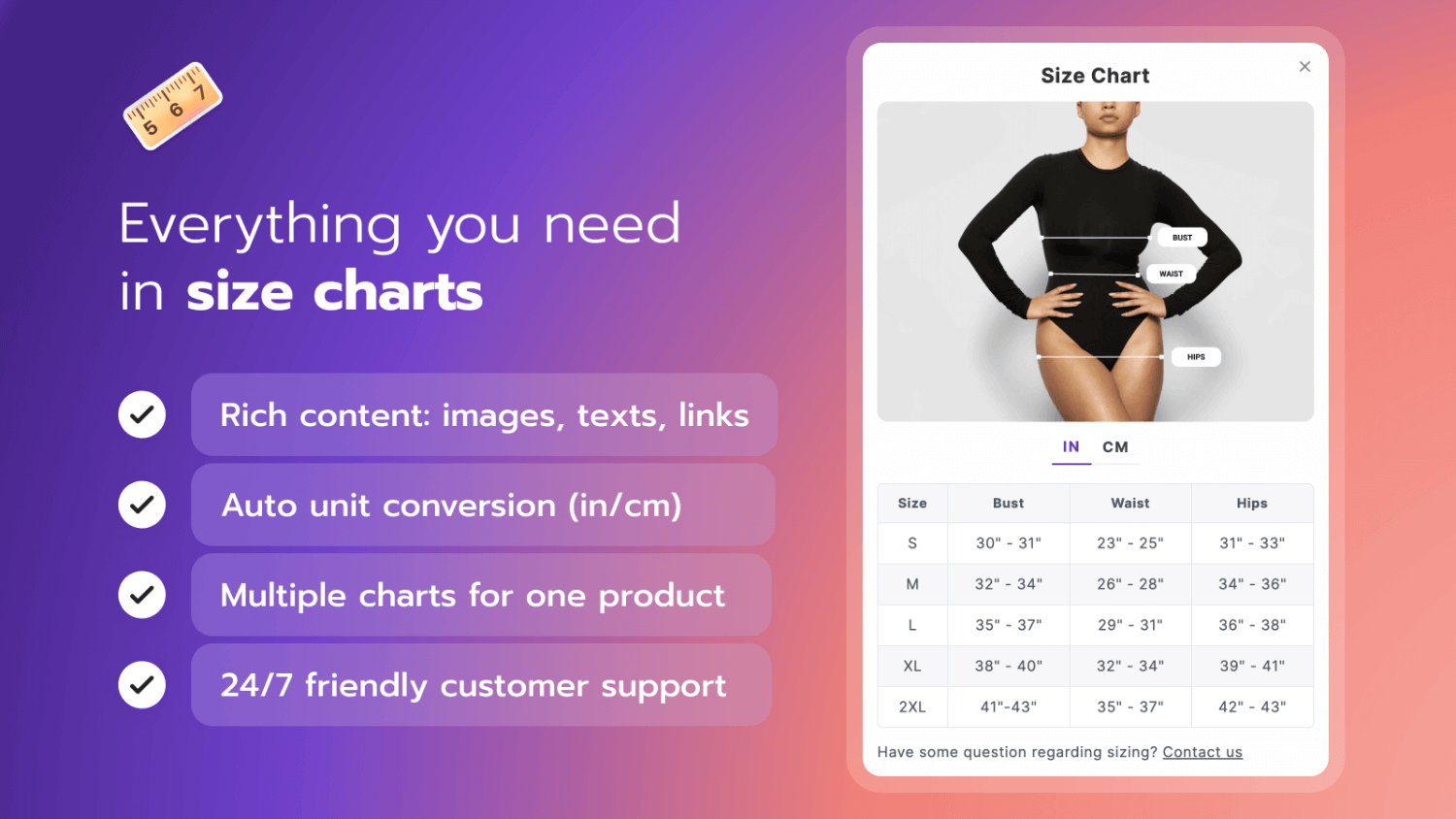 ⚡ Lightning-fast load speed—built with Shopify metaobjects 🌍 Fully localized for global shoppers with Shopify Markets support 📏 Supports multiple size charts for different products or categories 🖼️ Visual size guides with images for better clarity and conversions 🛠️ Feels native—easy to manage, no-code, seamless integration