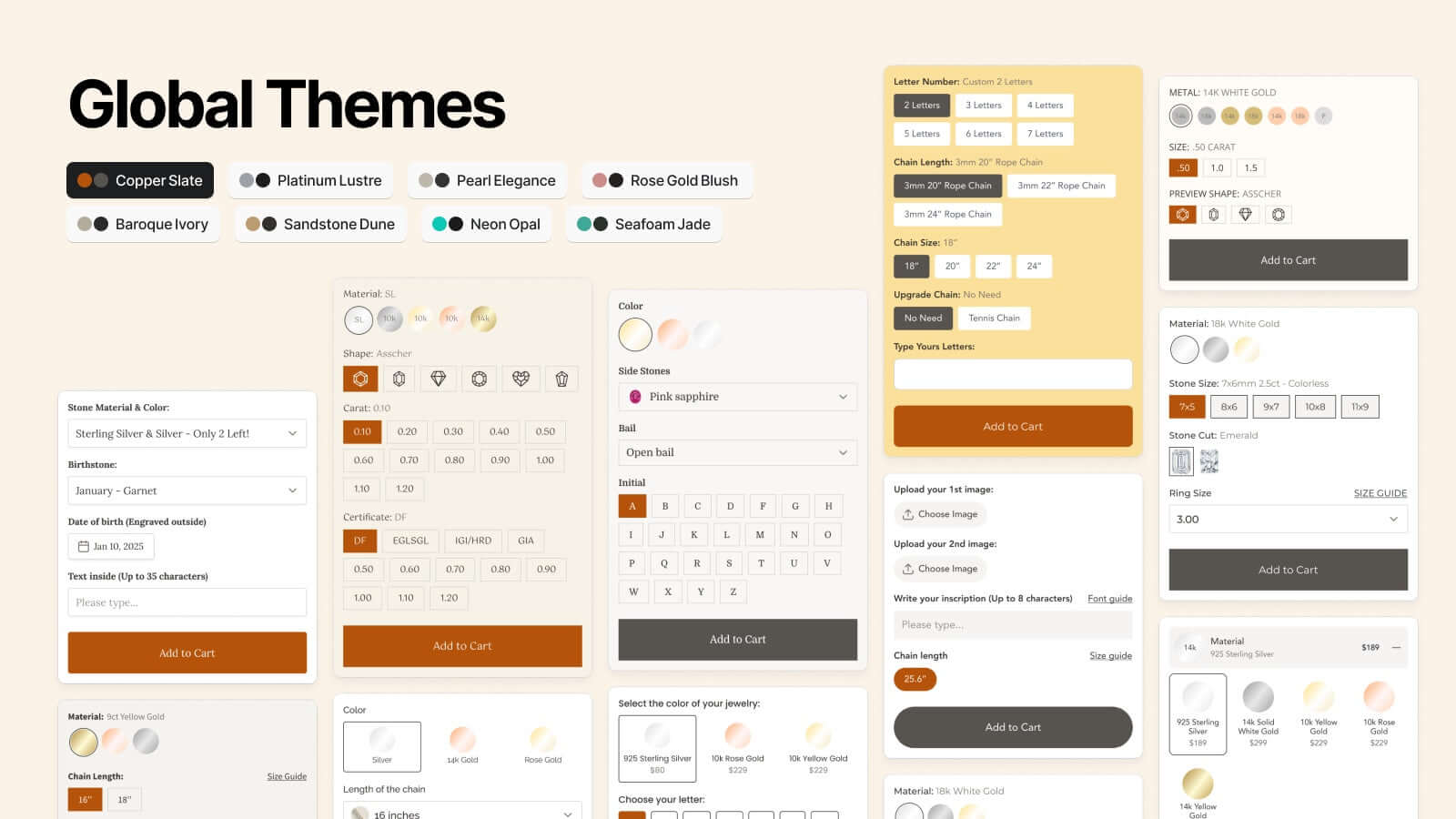 • スウォッチ、アップロード、ドロップダウン、テキストフィールドなど、すべての入力タイプをサポートします。
