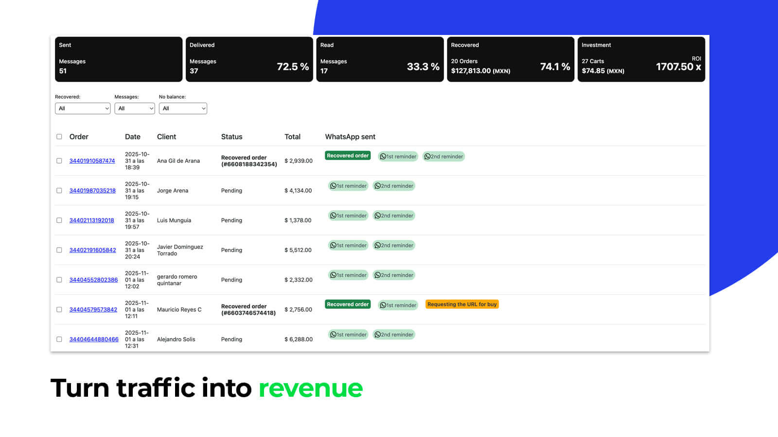 GO Recoverは、WhatsAppのフォローアップ機能を使って、放棄されたカートを注文完了に変えます。