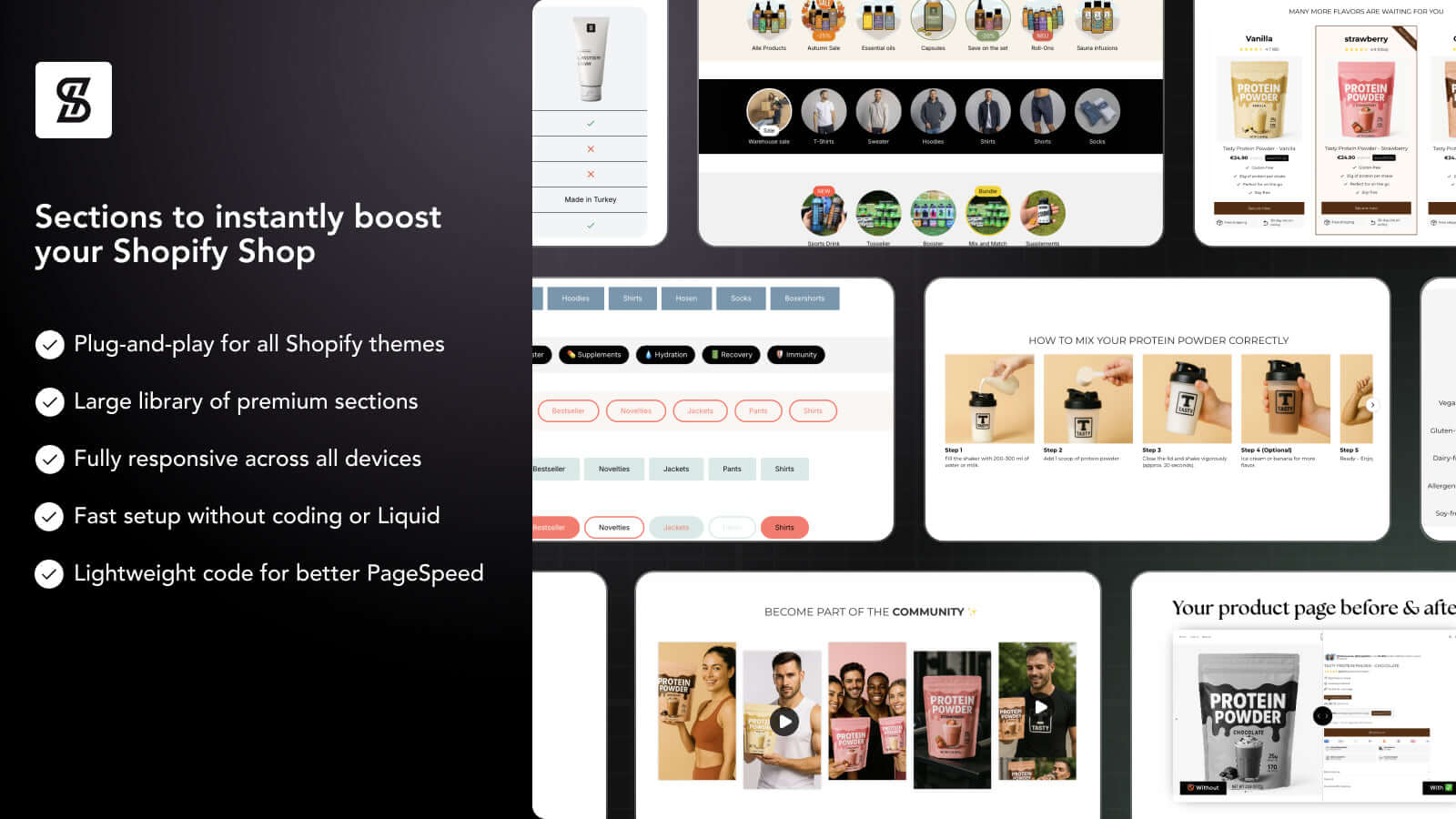 • 新しいセクションやブロックを任意のShopifyテーマに即座に追加できます。