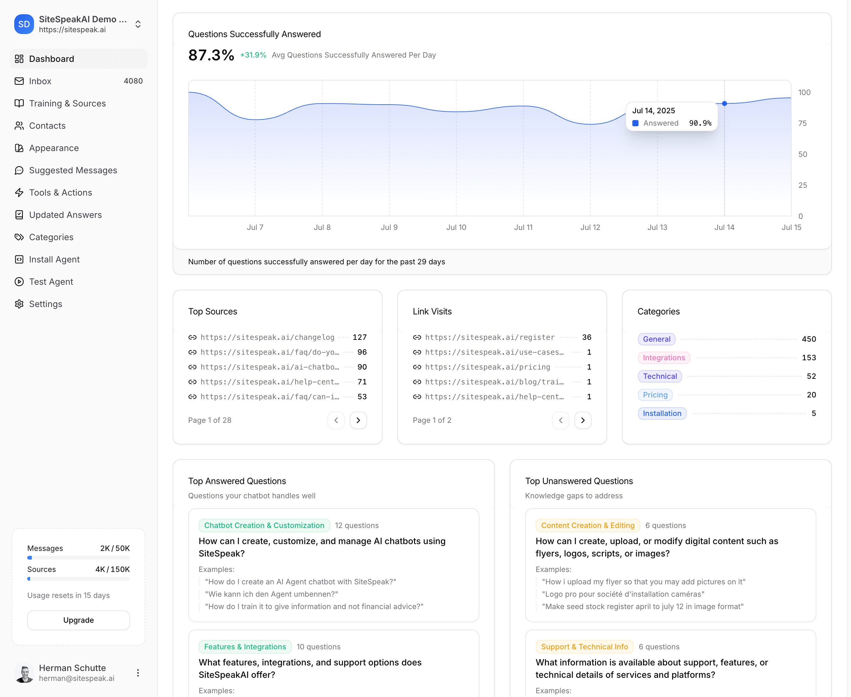 分析ダッシュボードには、ユーザーからの質問、知識のギャップ、エージェントのパフォーマンスが明らかになります。