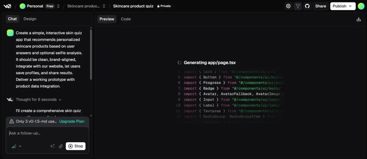v0 の AI は、レイアウトの改良、ロジックの追加、UI デザインの改善に役立ちます。