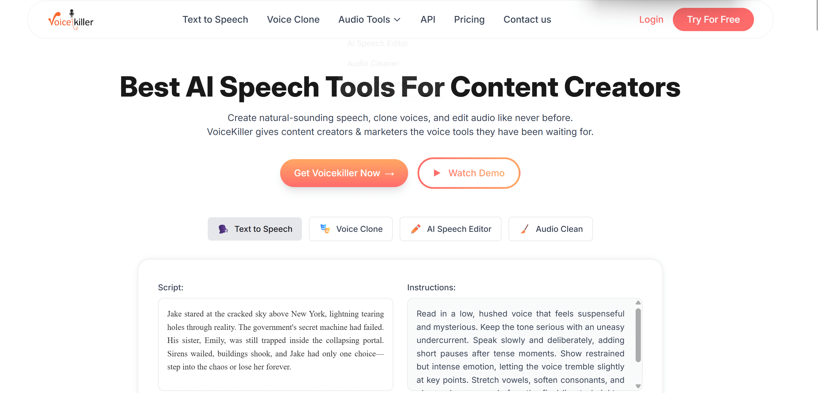 🗨️ Text-to-Speech with Acting Instructions Choose from 90+ voices in 70+ languages and control tone, emotion, and delivery style (e.g. excited, crying, pirate, villain) 🧬 Voice Cloning with Emotion Control Clone your own or others’ voices with just 2 seconds of audio — adjust tone to happy, sad, angry, etc. ✏️ AI Speech Editor Fix mistakes or change spoken words by editing the transcript — no need to re-record 🎛️ Audio Cleaner Remove background noise (dogs, typing, traffic) and enhance recordings to studio quality 🎭 Voice Changer Instantly transform one voice into another 🔌 API Access Integrate VoiceKiller into your own apps or workflows