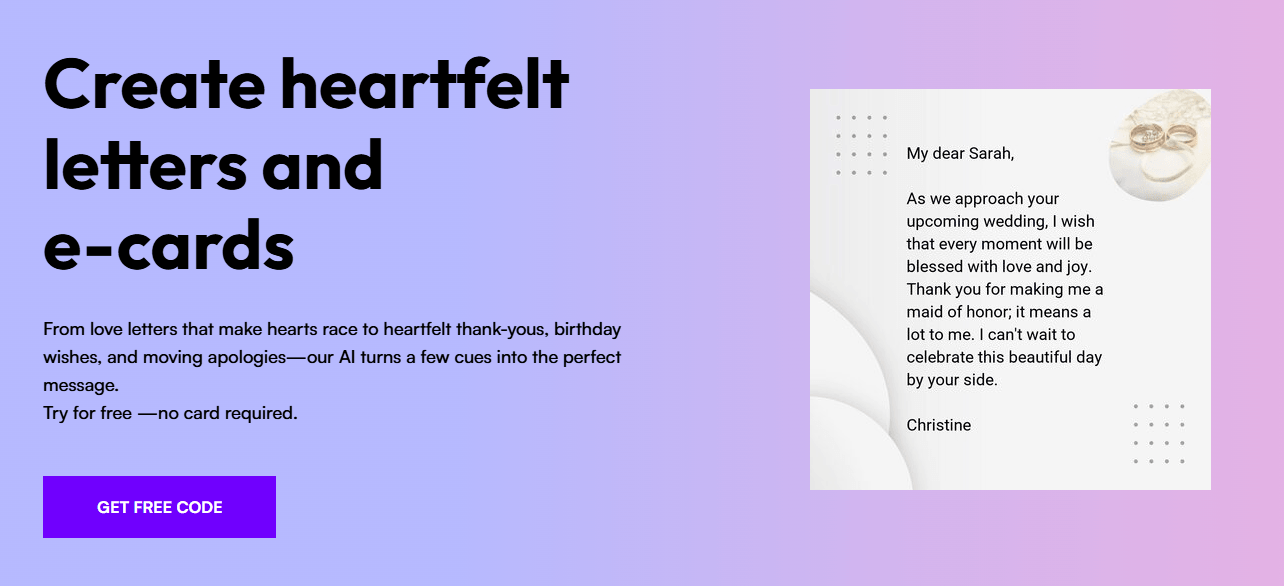 AIを搭載したレターおよびEカードジェネレーターにより、あらゆる場面で心のこもったパーソナライズされたメッセージを書くことができます。