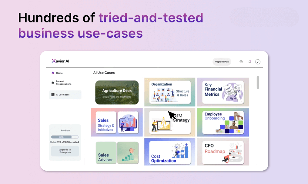 Xavier AIは、指先ひとつで仮想コンサルティング会社のように機能するAI搭載プラットフォームです。ピッチデッキの作成、ビジネスプランの作成、販売戦略の概要作成のいずれを行う場合でも、Xavier は高品質で事実に裏付けられた、カスタマイズ可能なプレゼンテーションをオンデマンドで生成します。