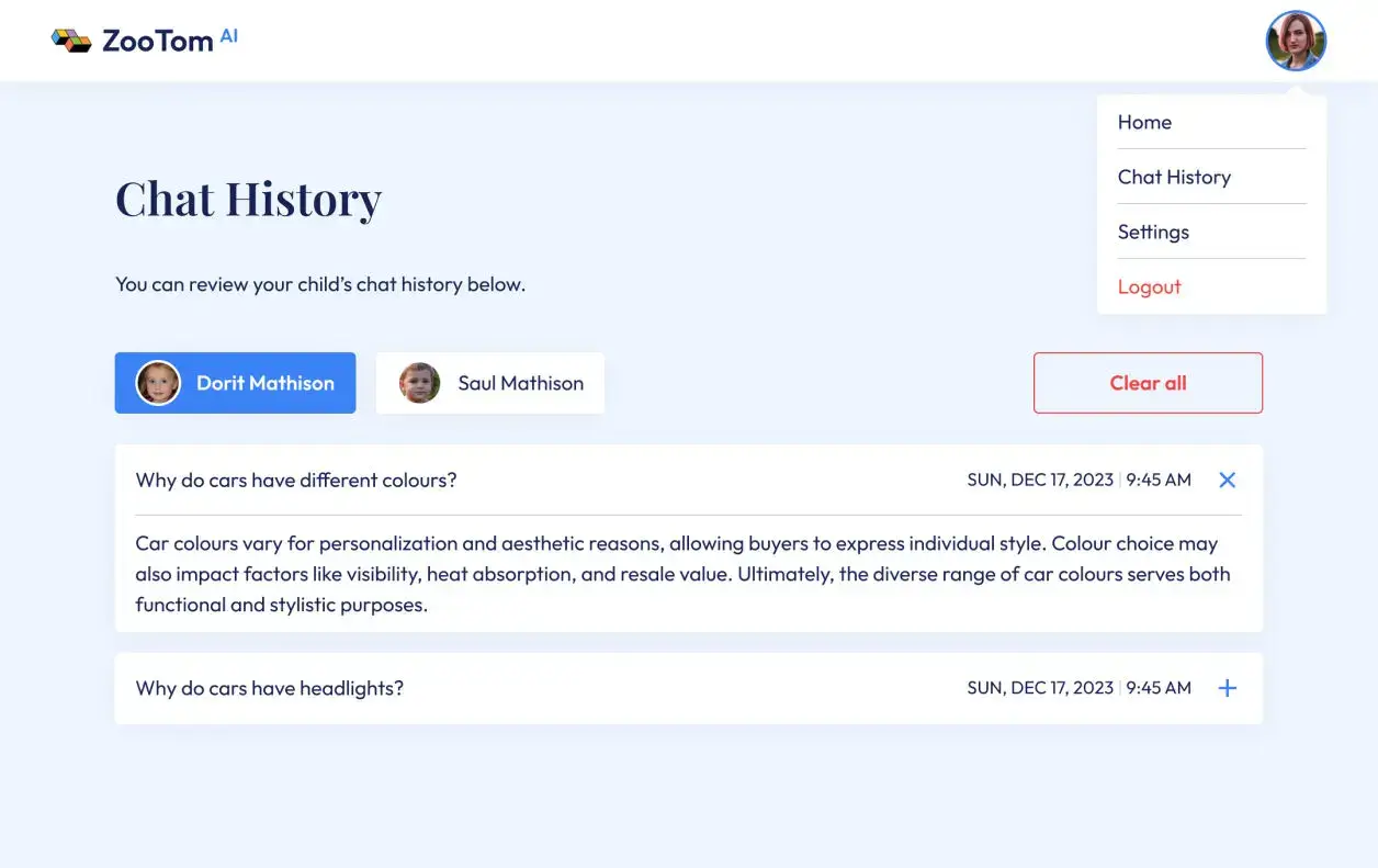 包括的な保護者モニタリング:Zootom AI は保護者向けの無料コンパニオンアプリを提供しています。これにより、お子様の AI とのやりとりを積極的に監視できるため、安心できます。